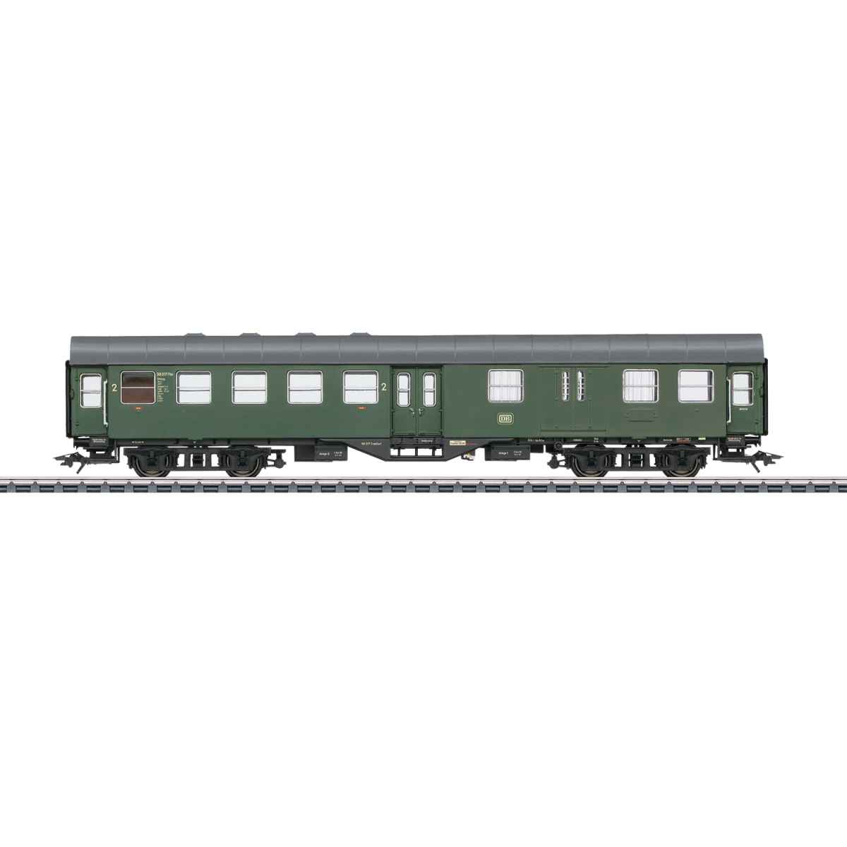Vorbild: 4-achsiger Personenwagen der Deutschen Bundesbahn (DB). Umbauwagen 2. Klasse mit Gepäckraum BD4yge. Ausführung um 1959 in Flaschengrün.